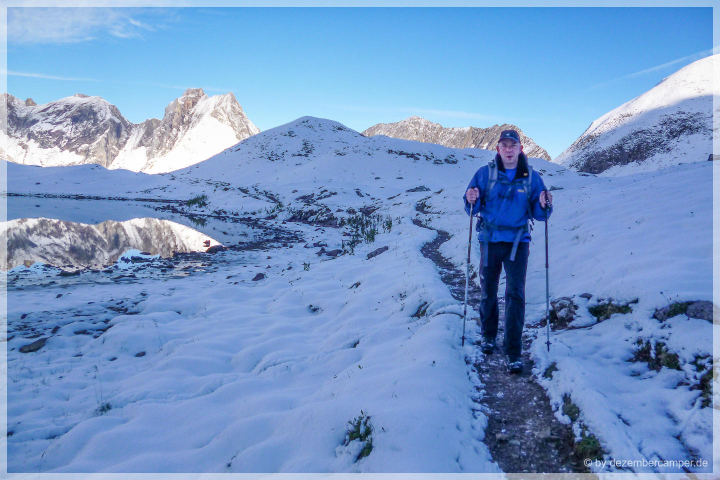 Tag 3 der Alpenüberquerung war angebrochen. Es war Ende August und wir machten mitten in einer Schneelandschaft auf. Das war ehrlich gesagt nicht das, was wir uns vorher so vorgestellt hatten. Aber der Himmel war blau und es versprach ein sonniger Tag zu werden. Schon vor 7 Uhr machten wir die ersten Fotos, eine Stunde später ging es gut gestärkt und mit unseren großen Rucksäcken bepackt los. Die Heizung hatte es letzte Nacht leider nicht geschafft, die Wanderschuhe richtig zu trocknen. Aber eine Wahl hatten wir nicht – also rein in die nassen Stiefel.