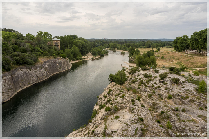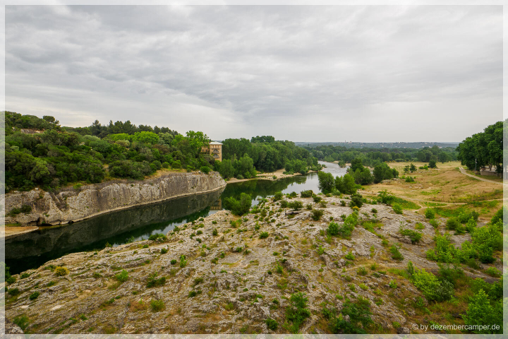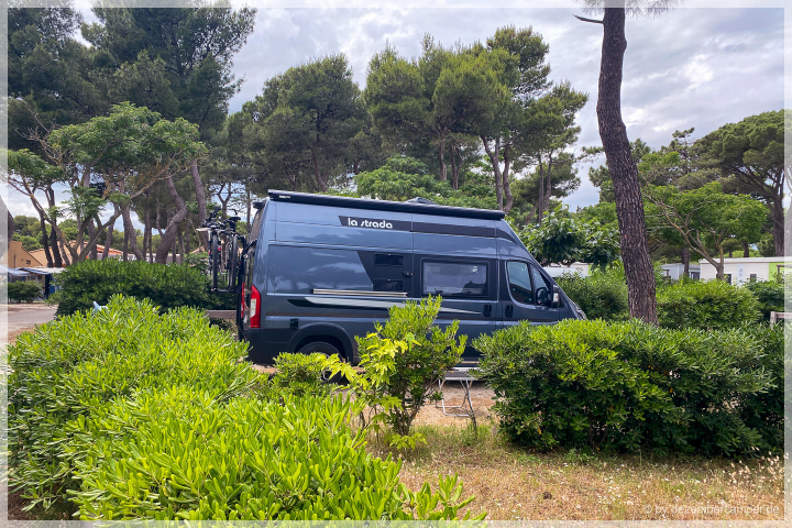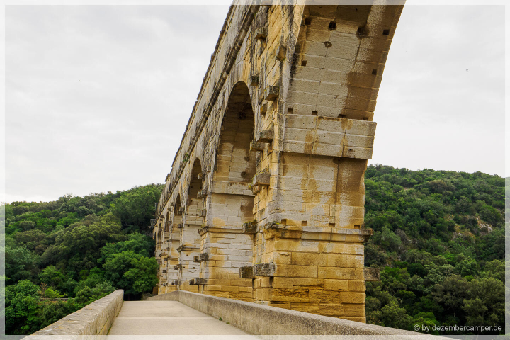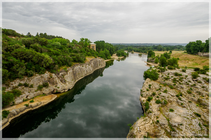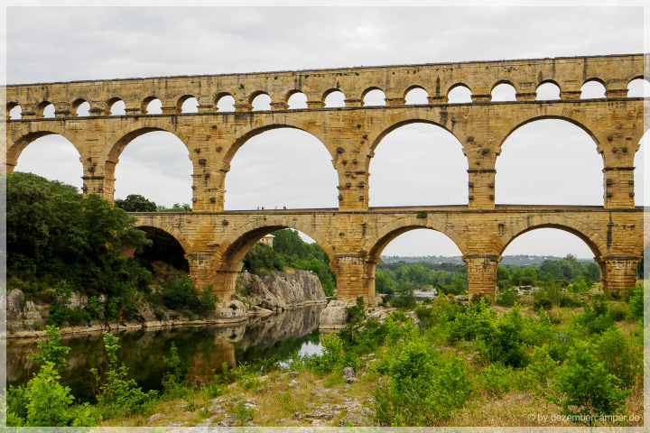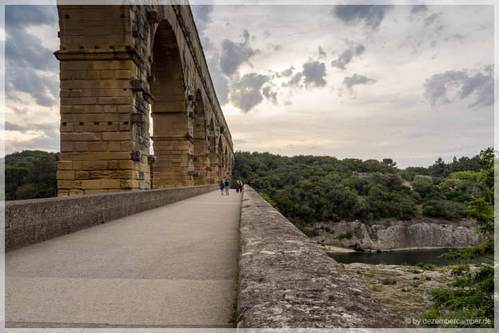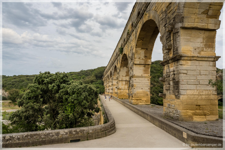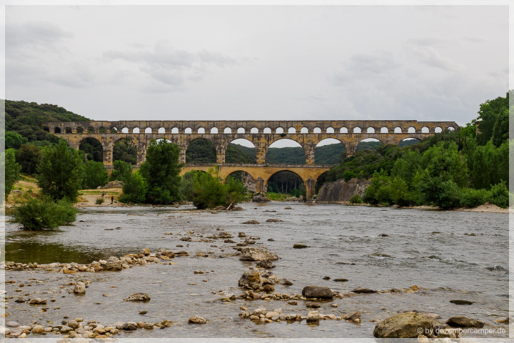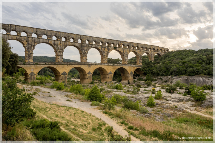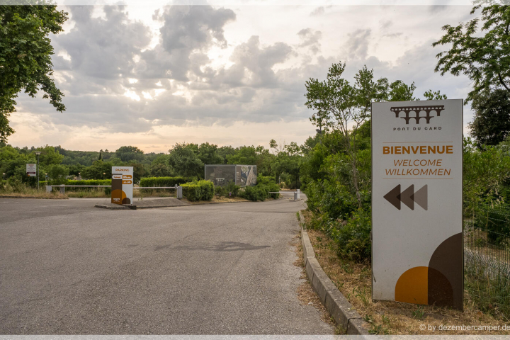 Während der Fahrt checkten wir verschiedene Stell- und Campingplätze. In den Städten Orange und Avignon schien alles voll zu sein, und auf „irgendwo im Nirgendwo“ hatten wir keine Lust. Also entschieden wir uns spontan für den Campingplatz an der Pont du Gard – laut Homepage noch nicht ausgebucht, und die beeindruckende Brücke stand ohnehin schon lange auf unserer Wunschliste.