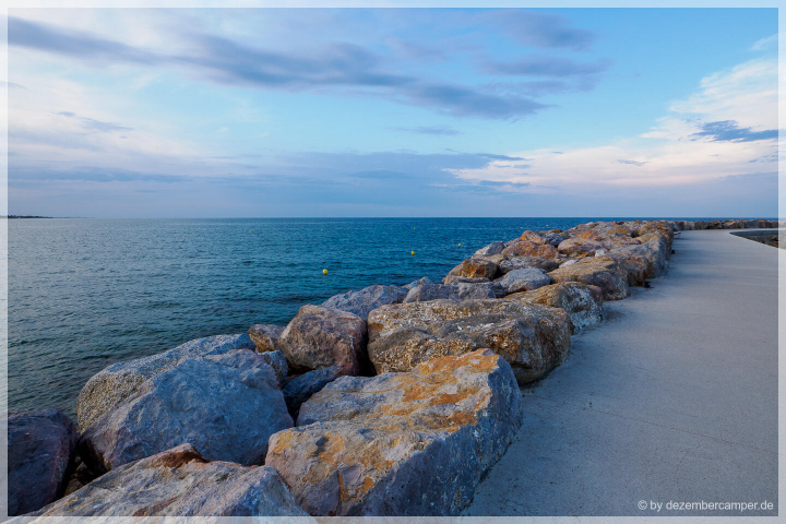 Am Nachmittag radelten wir noch zum Supermarkt und besorgten ein paar französische Leckereien fürs Abendessen: Baguette, Honigmelone, Shrimps, Käse und Salami – köstlich! Auch hier in Argeles-sur-Mer war für heute eigentlich Regen angesagt – doch wieder blieb es trocken und sonnig. Die Wolken schienen sich in den Bergen abzuladen, was uns natürlich nur recht war.