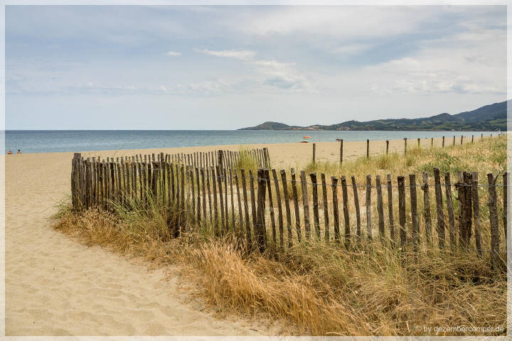 Natürlich schauten wir uns den Strand gleich an: breit, leer und mit Blick auf die Ausläufer der Pyrenäen – das gefiel uns. Das Wasser testeten wir heute nur mit den Füßen, vielleicht geht’s morgen richtig rein.