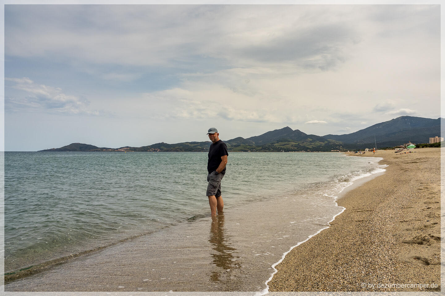 Natürlich schauten wir uns den Strand gleich an: breit, leer und mit Blick auf die Ausläufer der Pyrenäen – das gefiel uns. Das Wasser testeten wir heute nur mit den Füßen, vielleicht geht’s morgen richtig rein.