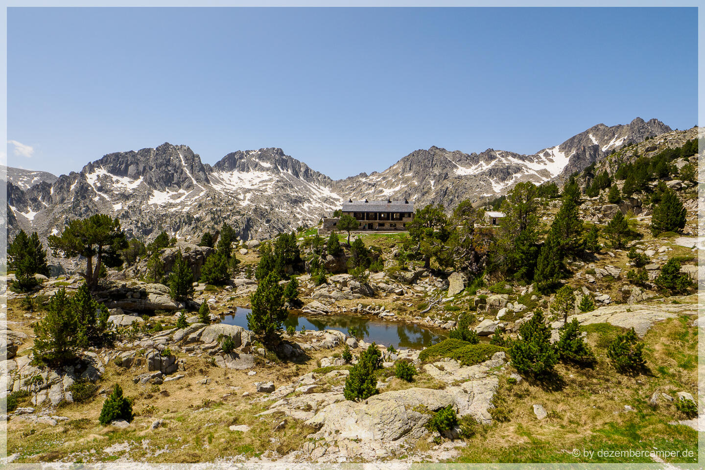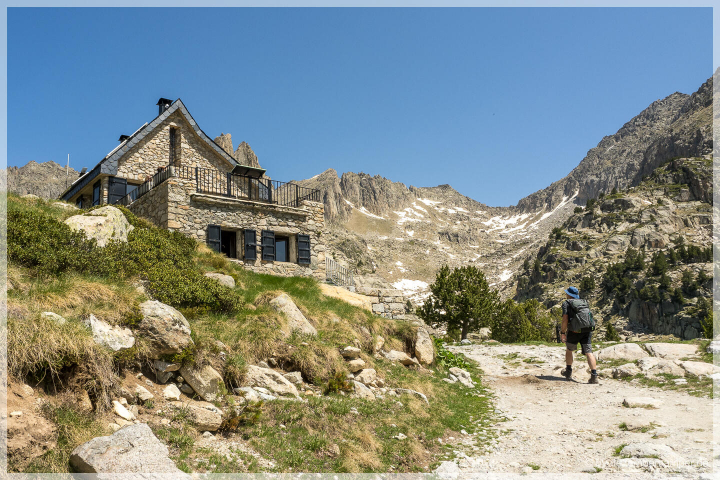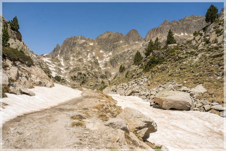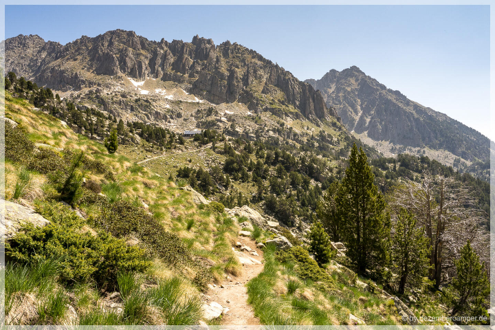 Hier oben gibt es viele Wandermöglichkeiten, wir entschieden uns für eine Runde, die laut Beschreibung besonders eindrucksvolle Ausblicke bieten sollte. Zunächst folgten wir dem Pfad zum Refugi d’Amitges, etwa zwei Stunden entfernt. Der Weg führte rechts am großen Maurici-See entlang, dann vorbei an einem imposanten Wasserfall, stetig bergauf. Die Landschaft war beeindruckend – stellenweise erinnerte sie uns an die kanadischen Rocky Mountains, dann wieder an die Dolomiten. Immer wieder tauchten kleine Bergseen auf, umgeben von schneebedeckten Gipfeln, und Bäche ergossen sich ins Tal.