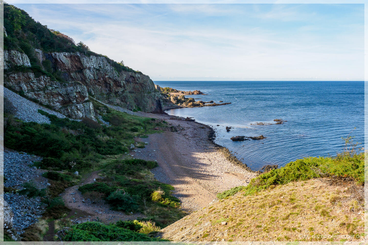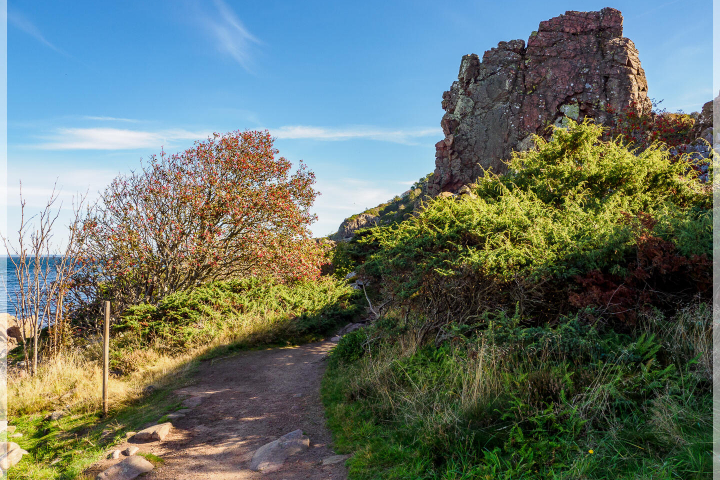 Die ersten Kilometer folgten dem Skaneleden und verliefen mehr oder weniger durch den Wald, boten nur selten einen Ausblick aufs Meer. Nach ca. vier Kilometern bog der Weg Richtung Wasser ab und die Ausblicke wurden interessanter. Wir passierten noch einen kleinen Ort am Meer, hier standen echt schicke Häuser, keine so schlechte Lage zum Wohnen…