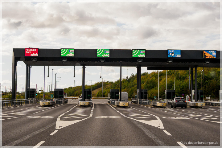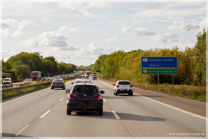 Wir buchten online noch schnell das Ticket für die Øresundbrücke (430DKK), damit sollte man über Kennzeichenerkennung schnell über die grüne Spur kommen. Leider öffnete sich die Schranke nicht. Als wir auf den „do you need help“-Button gedrückt hatten, öffnete sich die Schranke und es stand ganz kurz etwas von BIZZ und 910DKK auf dem Display, aber verschwand sofort wieder. Hatten wir jetzt doppelt bezahlt? Und hatte das erste Ticket (für 6 Meter) wegen der Fahrräder nicht funktioniert? Bei unserer letzten Fahrt über Brücke und Fähre hatte man uns am Schalter gesagt, dass wir trotz Fahrräder nur das 6Meter-Ticket brauchen, zumindest auf der Brücke. (Fähre ist nochmal etwas anderes). Die Stornierung des ersten Tickets funktionierte auch nicht, wir waren also gespannt, ob da noch ne zweite Abrechnung kommt… (Update: kam zum Glück nie – d.h. wir hatten letztendlich doch nur den 6-Meter-Preis bezahlt). Die Straßen in Dänemark waren voller als auf der E6 in Schweden.