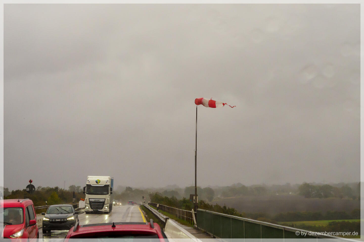 Fehmarn empfing uns entsprechend mit Sturm und Starkregen, der mehr horizontal als vertikal aufs Auto peitschte. Deshalb fuhren wir auch schnurstracks aufs Festland, wo zum Glück der Wind immer weiter nachließ. Am Anfang war die A1 noch leer, je näher wir Hamburg kamen, desto voller wurde es. Das änderte sich auch auf der folgenden A7 kaum. Unglaublich viele LKWs schraubten sich gemeinsam mit uns nach Süden. Bei unserer Ankunft auf Fehmarn zeigte das Navi noch eine Zielzeit für daheim von 16:45. Durch Stau und Pausen schob es sich immer weiter nach hinten. Es wäre auf nach 19:30 rausgelaufen.